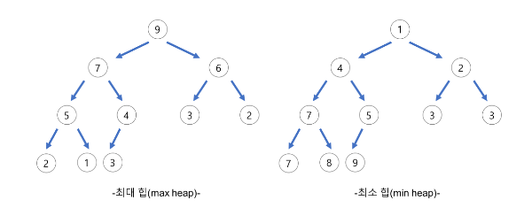 - 최대힙(Max Heap) : 부모노드 >= 자식노드 / 최소힙(Min Heap) : 부모노드 <= 자식노드