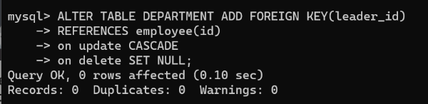 mysql> ALTER TABLE DEPARTMENT ADD FOREIGN KEY(leader_id)