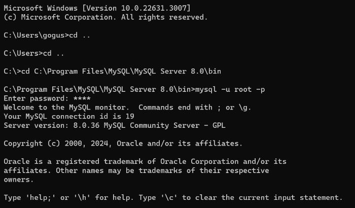 C:\>cd C:\Program Files\MySQL\MySQL Server 8.0\bin