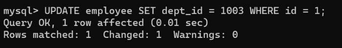 mysql> UPDATE employee SET dept_id = 1003 WHERE id = 1;