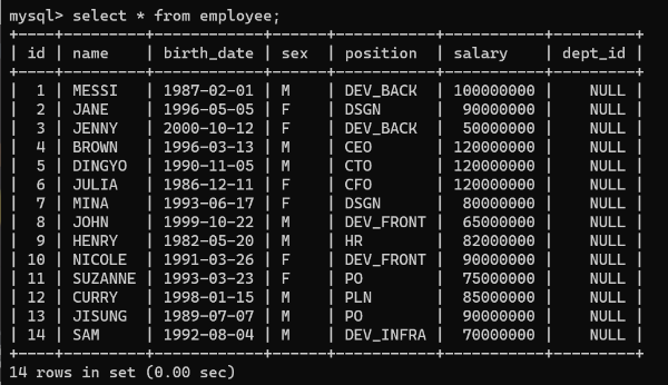 아래 employee 테이블의 dept_id가 null값으로 들어가 있으니 이걸 업데이트 해줄예정.