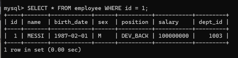mysql> SELECT * FROM employee WHERE id = 1;