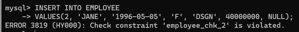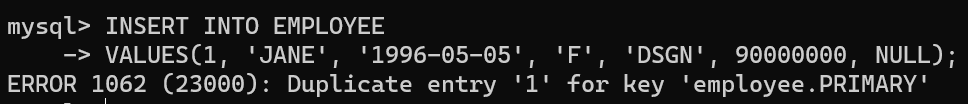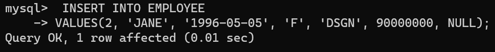 -> VALUES(1, 'JANE', '1996-05-05', 'F', 'DSGN', 90000000, NULL);