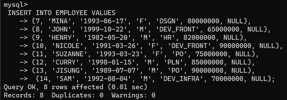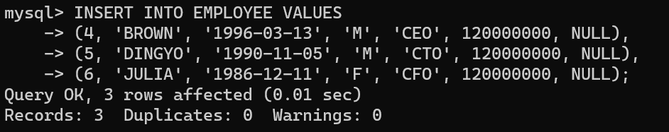 mysql> INSERT INTO EMPLOYEE