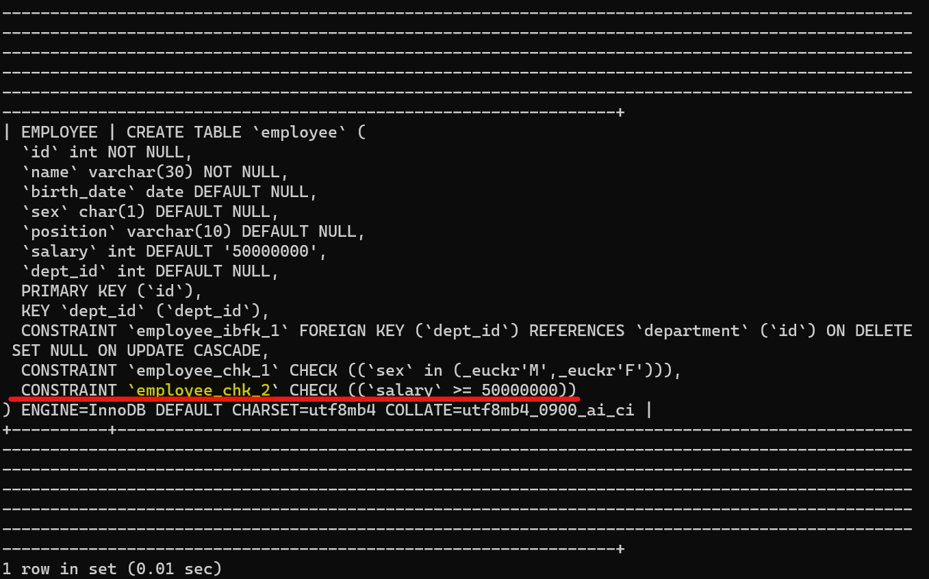 * Check constraint 'employee_chk_2' is violated. => 연봉 default 값을 50000000 으로 설정했기 때문.