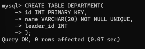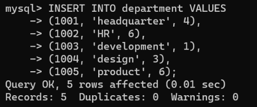mysql> INSERT INTO department VALUES