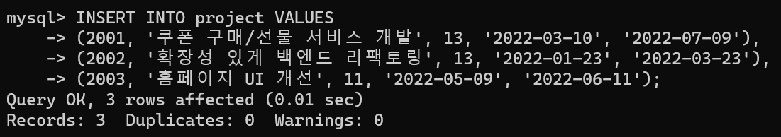 mysql> INSERT INTO project VALUES