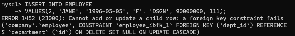 * Cannot add or update a child row: a foreign key constraint fails (`company`.`employee`, CONSTRAINT `employee_ibfk_1` FOREIGN KEY (`dept_id`) REFERENCES `department` (`id`) ON DELETE SET NULL ON UPDATE CASCADE)