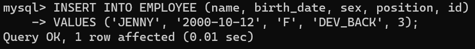 mysql> INSERT INTO EMPLOYEE (name, birth_date, sex, position, id)