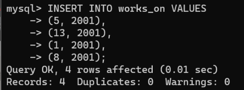 mysql> INSERT INTO works_on VALUES