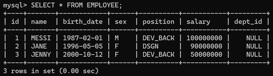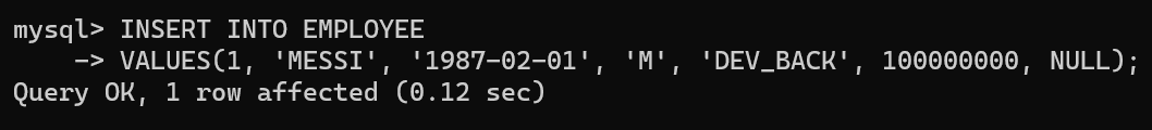 -> VALUES (1, 'MESSI', '1987-02-01', 'M', 'DEV_BACK', 100000000, NULL*);