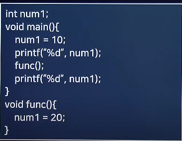 - 함수 블록 밖에서 선언하며 전체 함수에 영향을 미친다.
