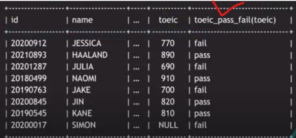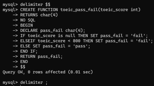 mysql> CREATE FUNCTION toeic_pass_fail(toeic_score int)