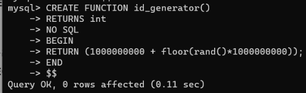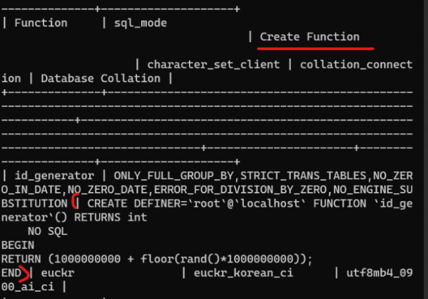 mysql> CREATE FUNCTION id_generator() 함수이름
