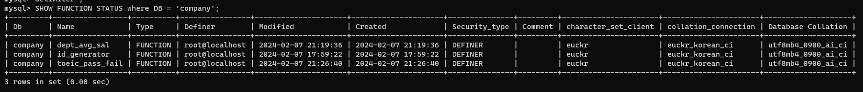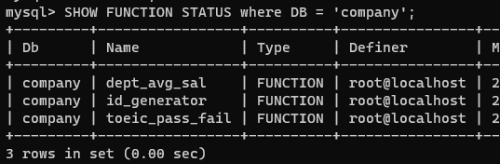=> 현재 활성화 되어 있는 DB인 'company'에 해당하는 function들이 만들어져 있다.