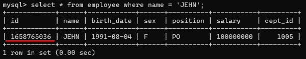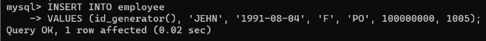 VALUES (id_generator(), 'JEHN', '1991-08-04', 'F', 'PO', 100000000, 1005);