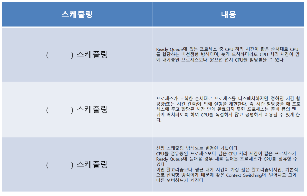 SJF (Shortest Job First) : 선점형 스케줄링 기법으로 CPU 점유 시간이 가장 짧은 프로세스에 CPU를 먼저 할당하는 방식.
