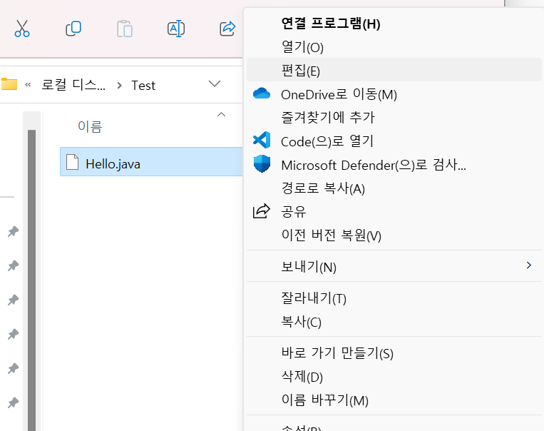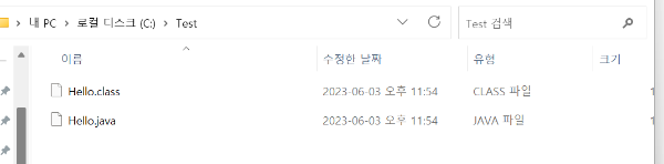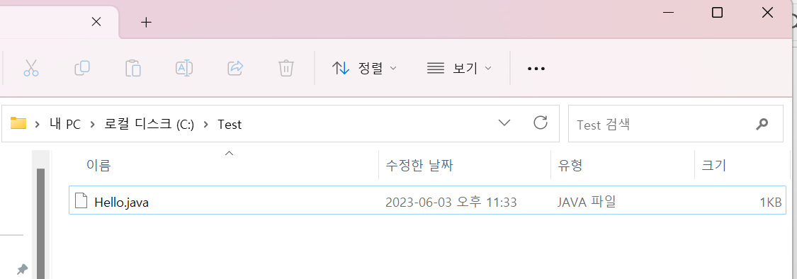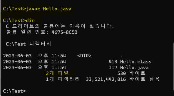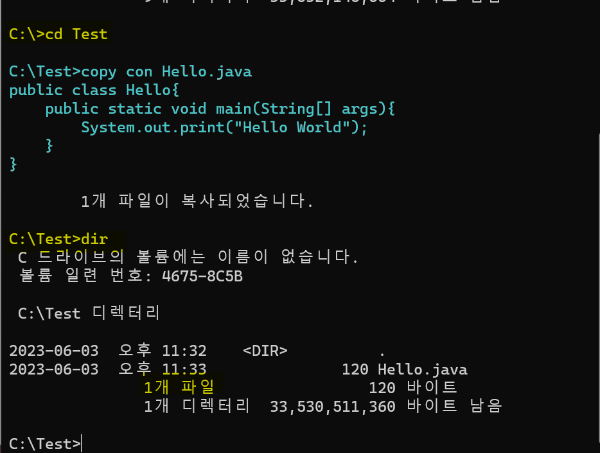> cd Test 입력(Test로 이동) > copy con Hello.java 입력후 다음줄부터 코드입력(대소문자 구분 중요*)
