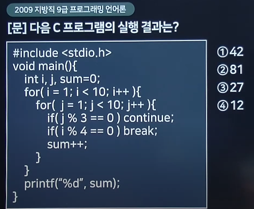 i가 9일때까지 7번 반복하면 (i가 4, 8일때 제외) sum = 42