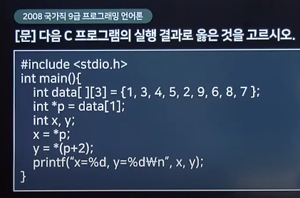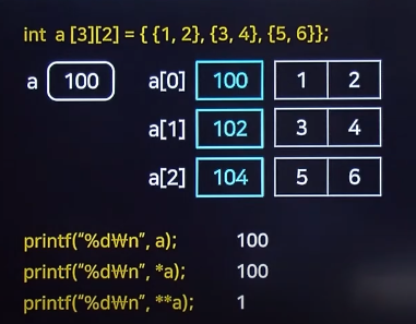 2차원 배열에서 *a는 a [0]의 주소값, **a는 a[0][0] 인 1.