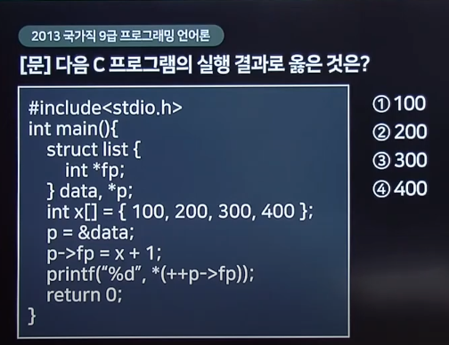 printf( '%d' , *(++(p -> fp)); => p가 가르키는 fp는 x + 1, 여기에 ++적용한 주소의 배열값.
