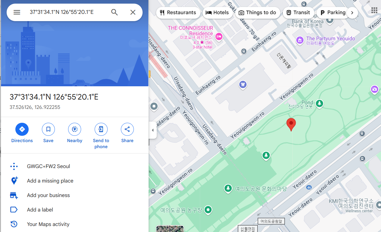 이렇게 나온 위도,경도 값인 ' 37.526126, 126.922255 '을 google map에 검색하면 지도에 위치가 뜬다.