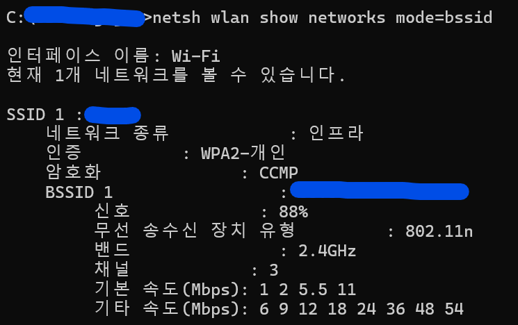 # netsh 명령 실행 (window) // linux : sudo iwlist wlan0 scanning