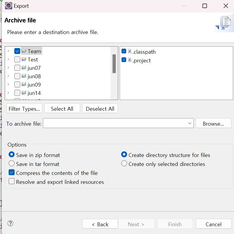 원하는 project 파일 선택후 Browse.. 에서 원하는 위치에 저장. => zip파일로 저장