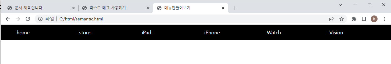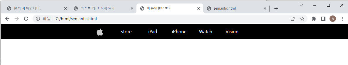[ 웹페이지 상단 메뉴바 만들기 ] _ 시멘틱태그 사용 (태그만 봐도 어떤 영역인지 알 수 있음)