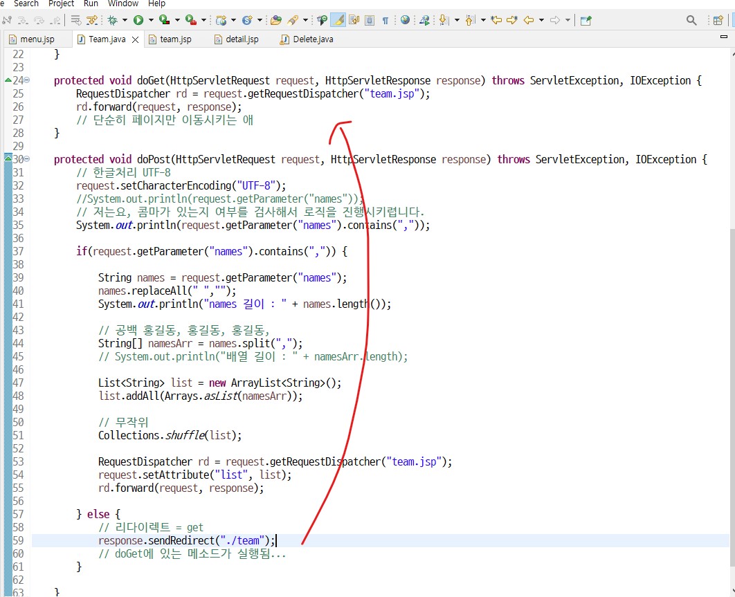 doGet() 메소드가 실행되어 team.jsp로 이동