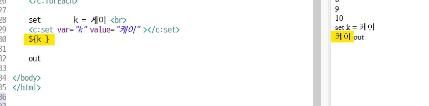 <c:set var="k" value="케이" /> 닫는태그 축약가능