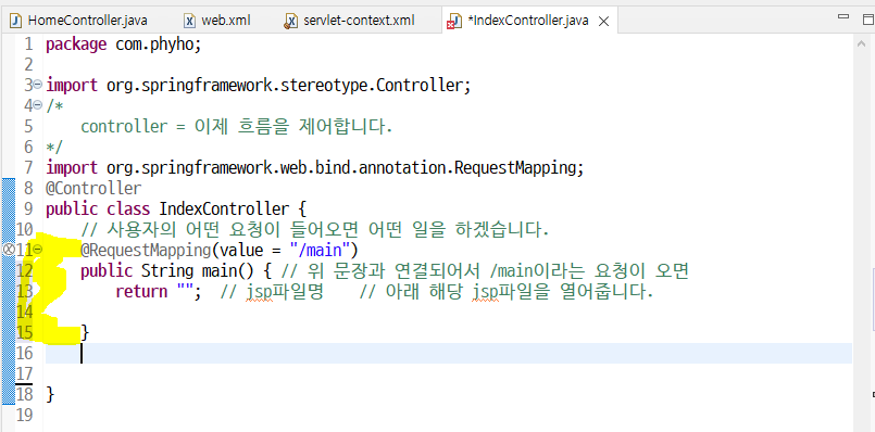 main요청이 들어오면 아래 main() 메소드가 동작, 즉 (" " 이라는 jsp파일을 열어줌)