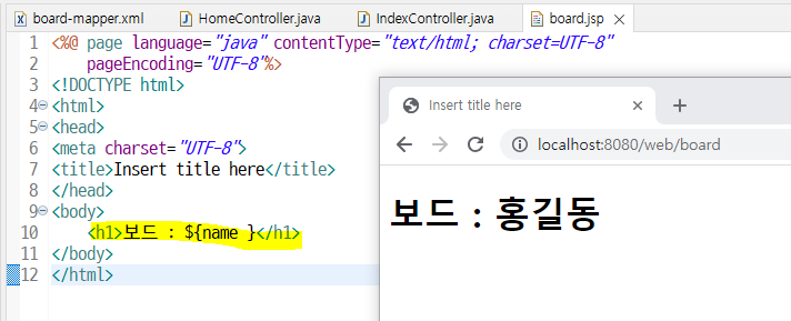 board.jsp를 열 때 "name"이라는 이름으로 "홍길동"이라는 값을 가져갈거