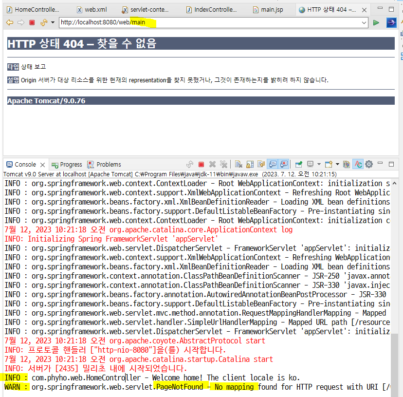 WARN : org.springframework.web.servlet.PageNotFound - No mapping found for HTTP request with URI [/web/main] in DispatcherServlet with name 'appServlet'
