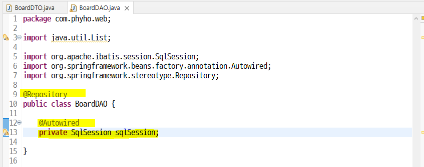 @Autowired 선언 _ SqlSession연결_ database-context.xml 에 beans로 이미 연결되어 있어서 사용가능