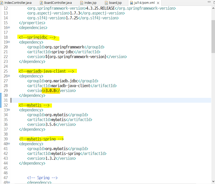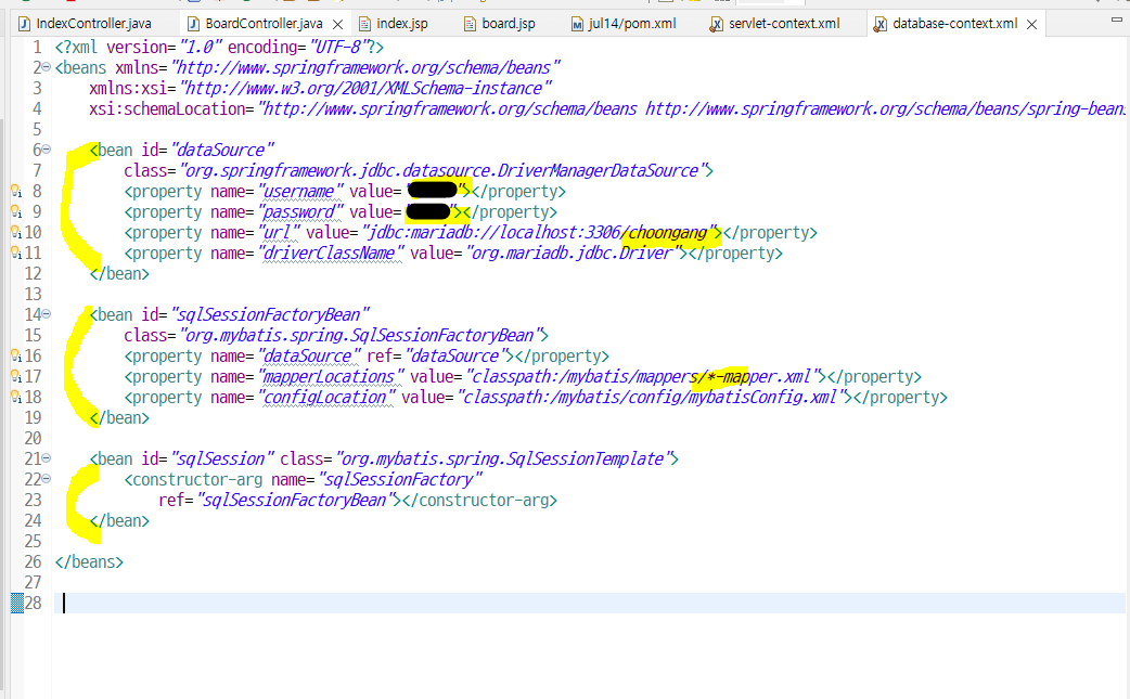 DB와 연결을 위해서 pdf에 있는 bean들 넣어주고 계정연결