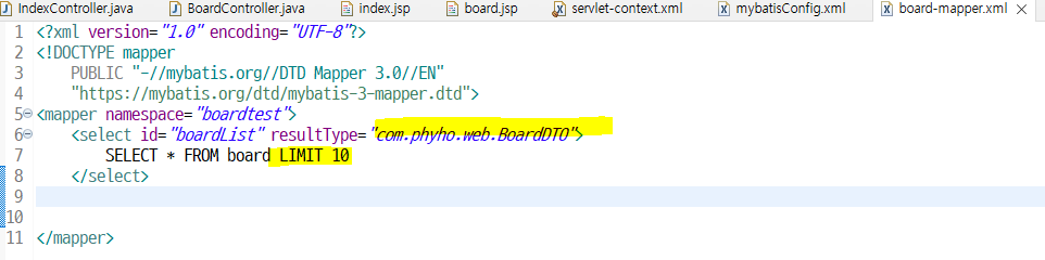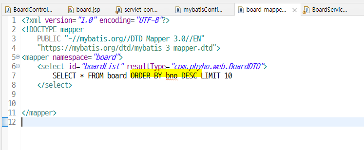 쿼리문 변경 : SELECT * FROM board ORDER BY bno DESC LIMIT 10