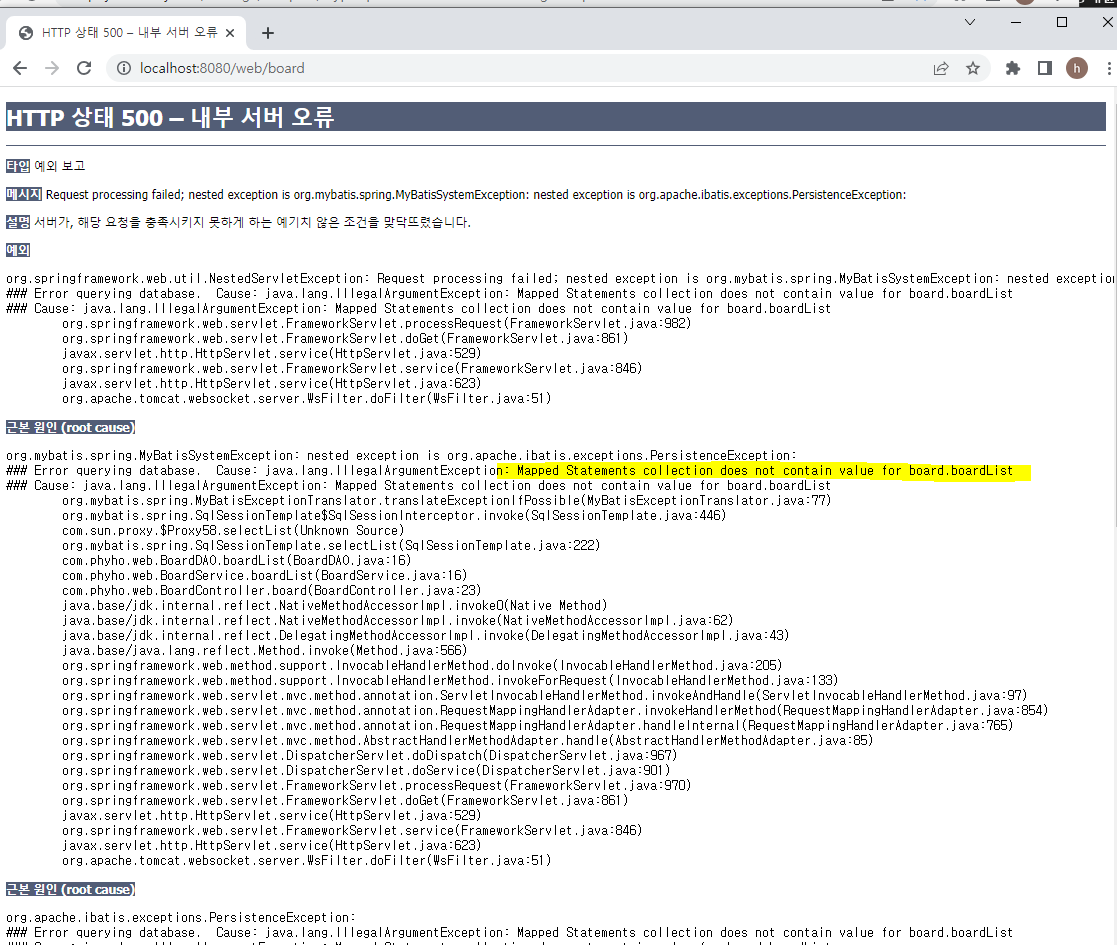 namespace = "boardtest" 로 되어있어서 아래의 오류가 났었음 => namespace = "board"로 수정필요