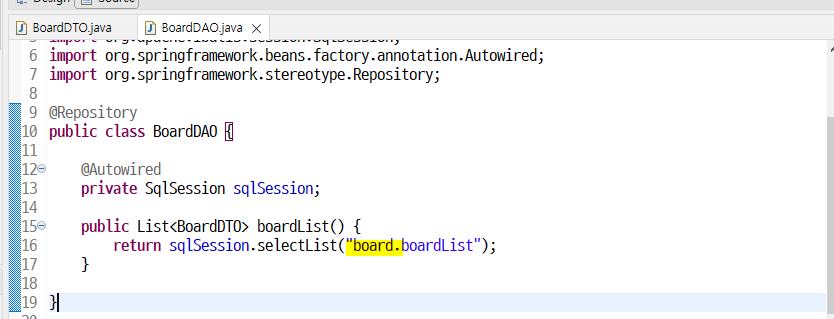 board-mapper.xml 에서의 namespace랑 DAO에서 불러올때의 이름을 맞춰줘야함