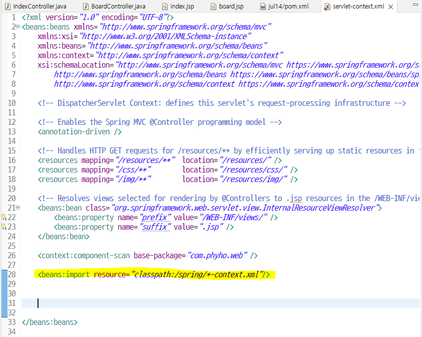 <beans:import resource="classpath:/spring/*-context.xml"/> 추가