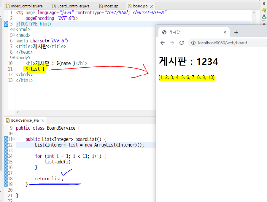 "list" 라는 이름을 붙여서 list의 값을 가지고 board로 가세요