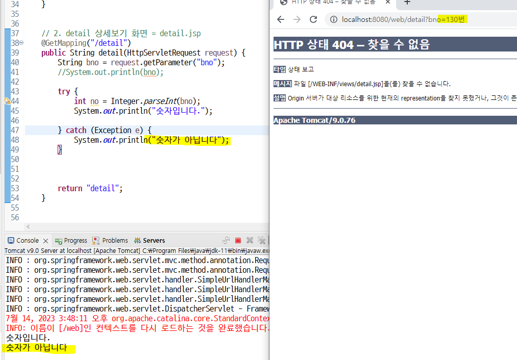 숫자가 아니면 콘솔창에 "숫자가 아닙니다" 출력