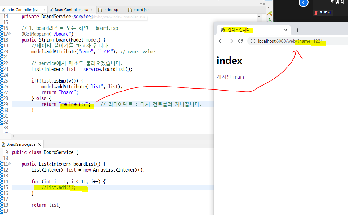 페이지는 똑같지만 위의 주소창에 model에 붙인 값이 불러와진걸 보면 컨트롤러를 지나온거 => redirect 실행됨.