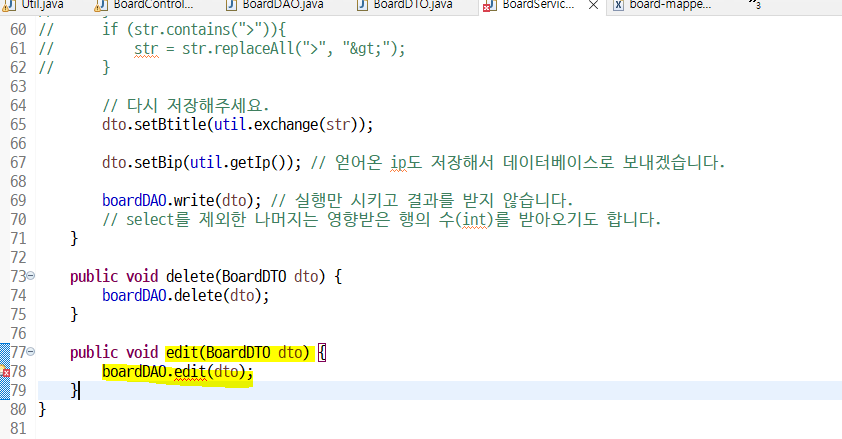 서비스에서는 DAO 한테 일 시킬거니까 밑줄클릭해서 DAO에 edit() 메소드 생성