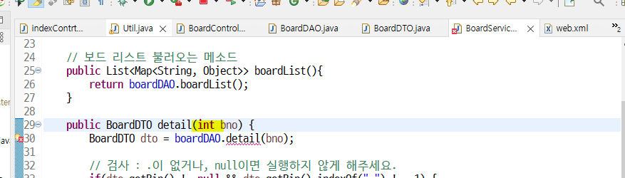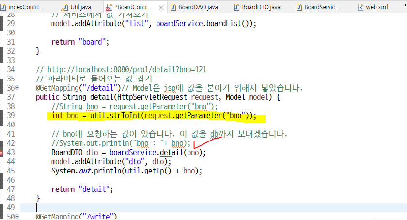 위의 체크부분 밑줄 클릭해서 detail() 메소드에서 받는 bno의 타입들을 int로 변경