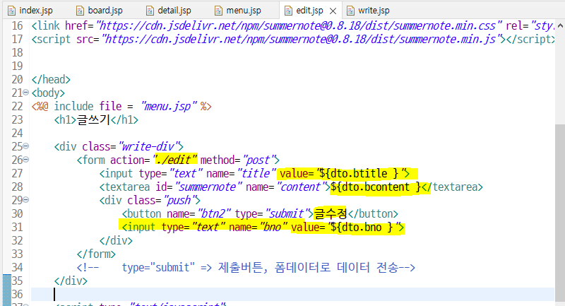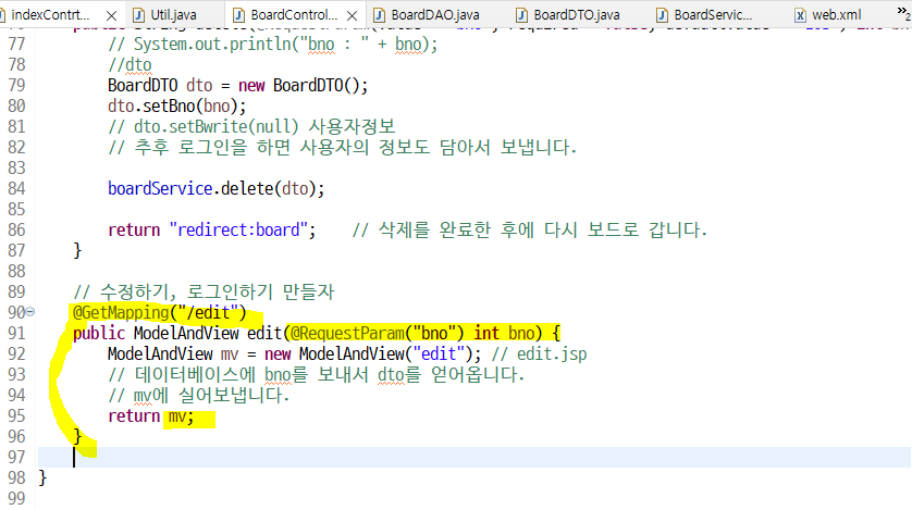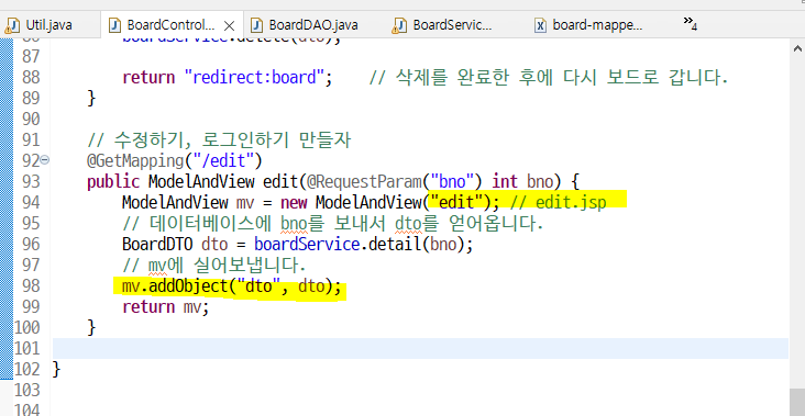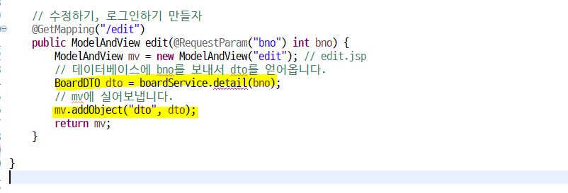 이제 아래의 mv에 "dto"라는 이름으로 dto를 붙여서 edit.jsp로 보낼 예정