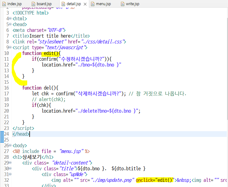 게시판에서 수정하기 버튼 클릭하면 onclick 이 실행이 되어서 edit() 메소드 실행