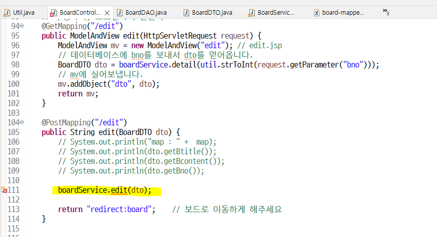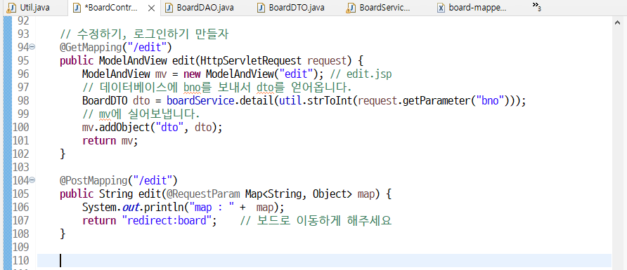 보드컨트롤러에서 아래처럼 다시 edit () 메소드의 매개변수를 request 로 받아오자