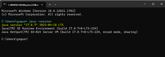 재부팅 후 다시 cmd에 java -version -> ver17 확인가능.