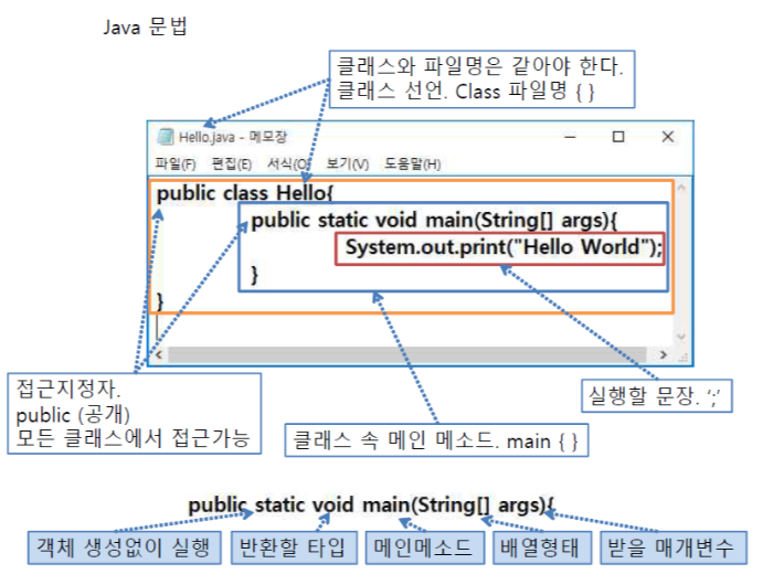 > cd Test 입력(Test로 이동) > copy con Hello.java 입력후 다음줄부터 코드입력(대소문자 구분 중요*)